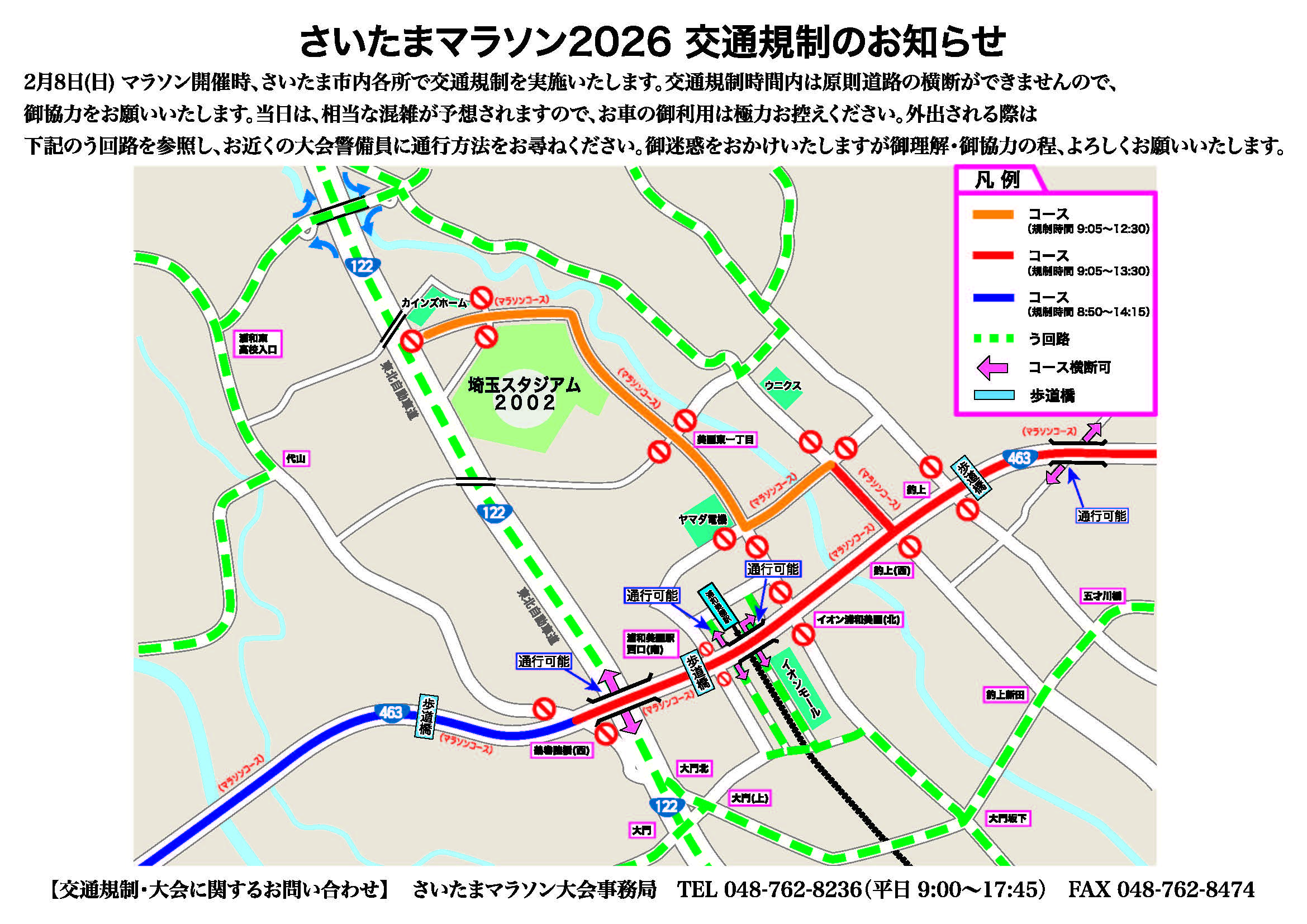 一方で、大会当日は広範囲で交通規制が実施され、日常の移動やお仕事、物件の内見などにも影響が出ます。添付いただいた「さいたまマラソン2026交通規制チラシ」をもとに、暮らし目線で押さえておきたいポイントを整理しました。
