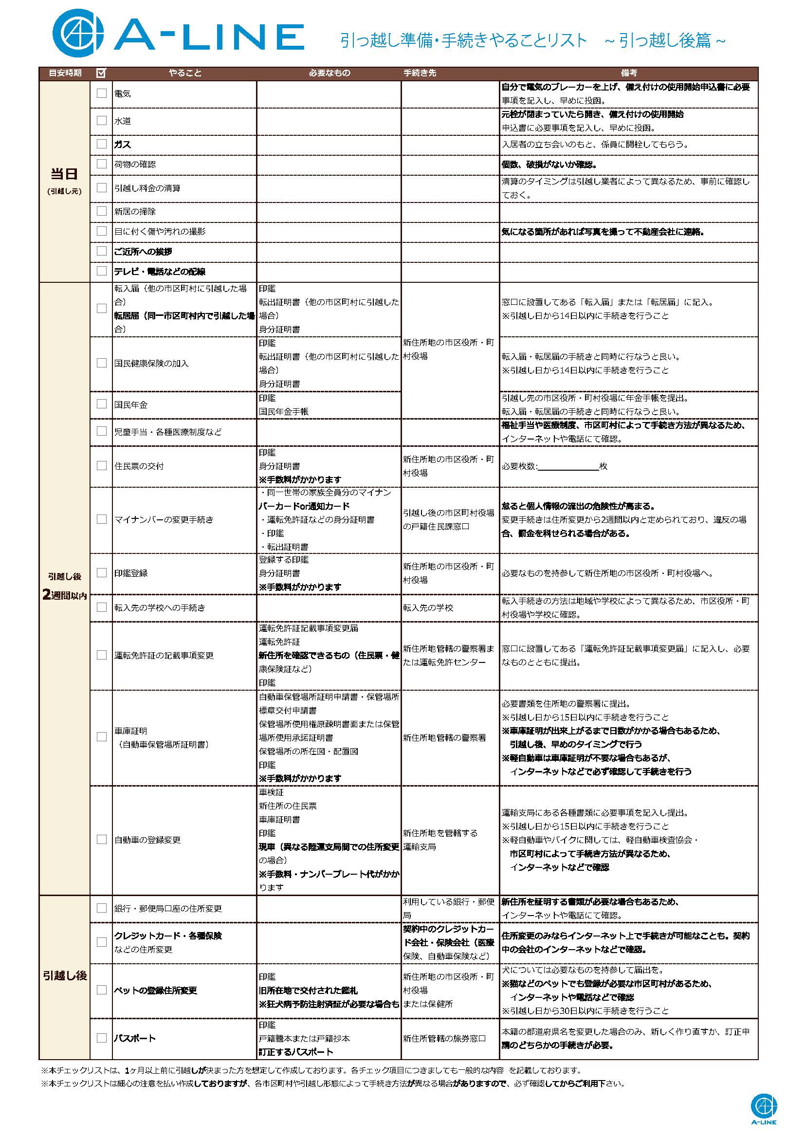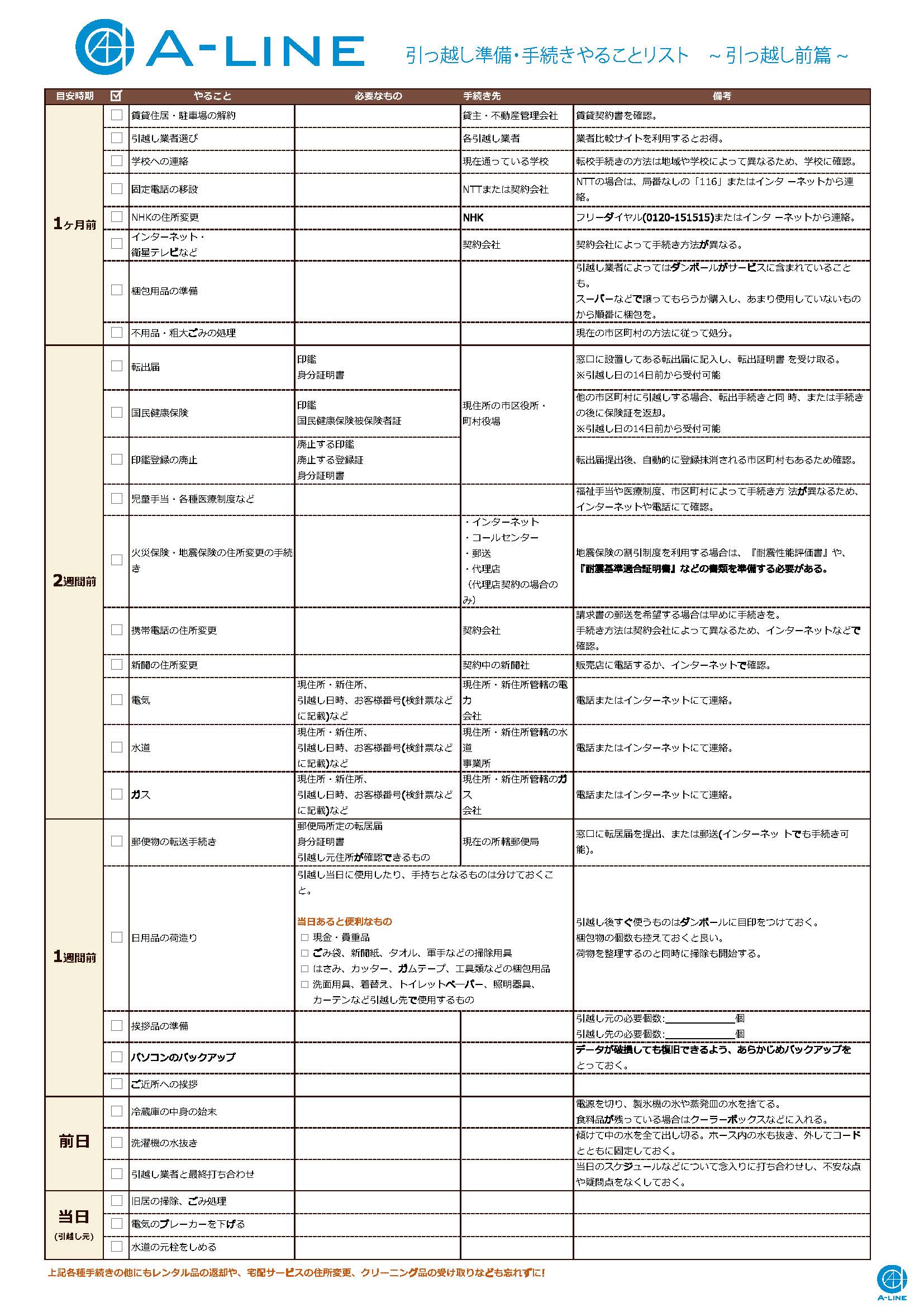 まずは、やることを見える形にしておくことです。その意味で、A-LINEの引っ越しチェックリストはとても使いやすい資料です。