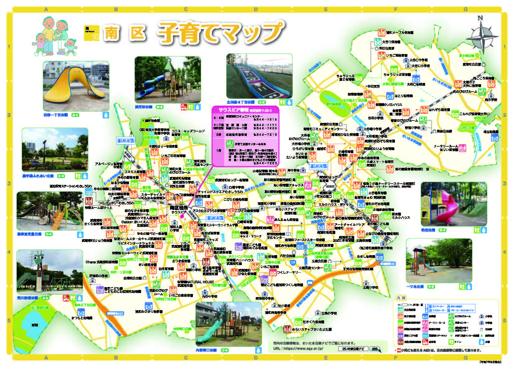 今回の「南区子育てマップ」を見ると、保育園や幼稚園、子育て支援施設、公園などが広範囲に分布しており、生活圏の中で子育てが完結しやすいことが一目で分かります。