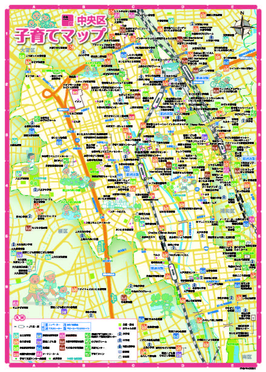 子育てマップ(1ページ目)を見ると、中央区は保育園・幼稚園・小規模保育施設が駅周辺に集中しているのが特徴です。