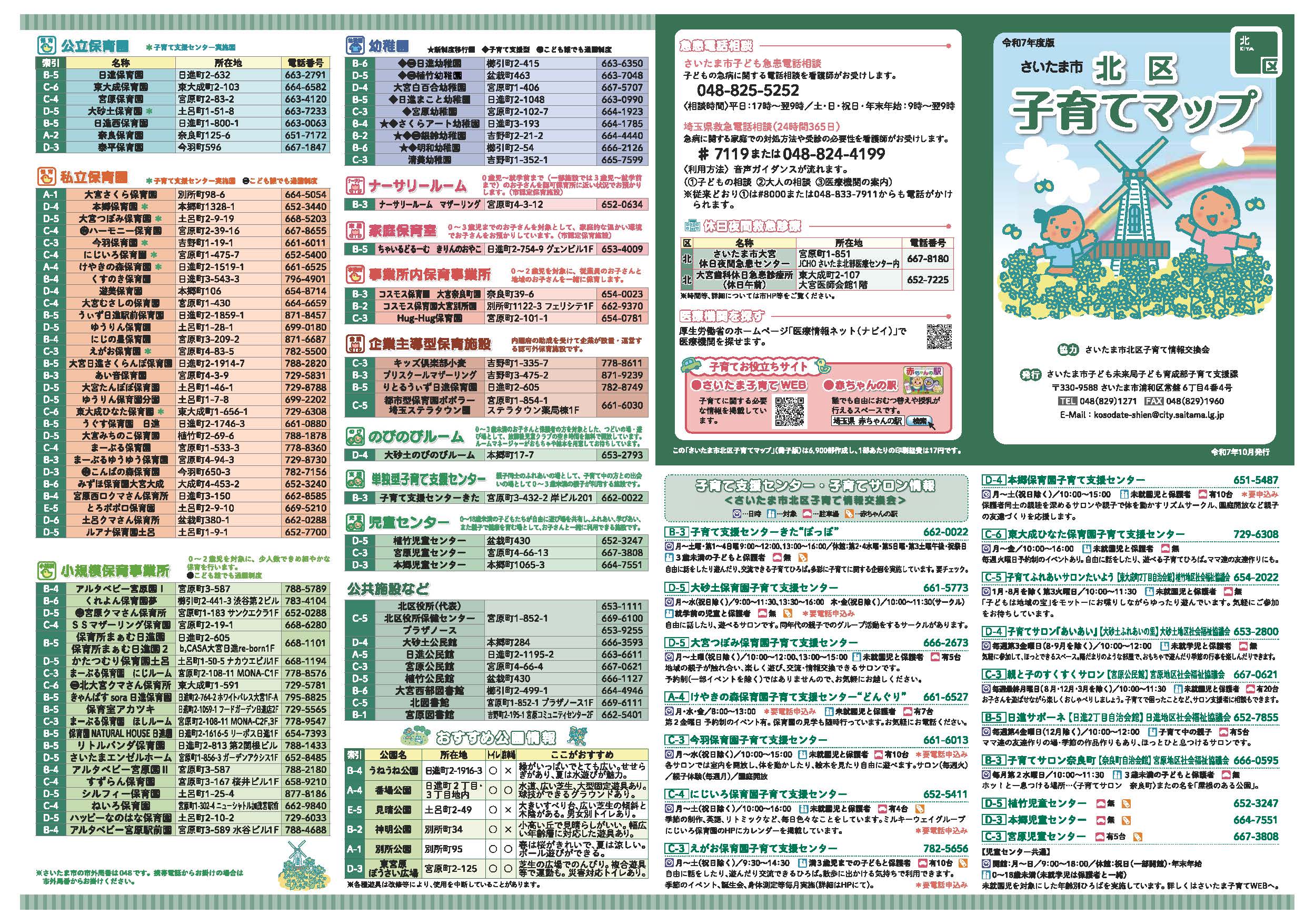 北区子育てマップ(1ページ目)を見ると、公立・私立保育園、幼稚園、小規模保育施設が各エリアに分散しています。