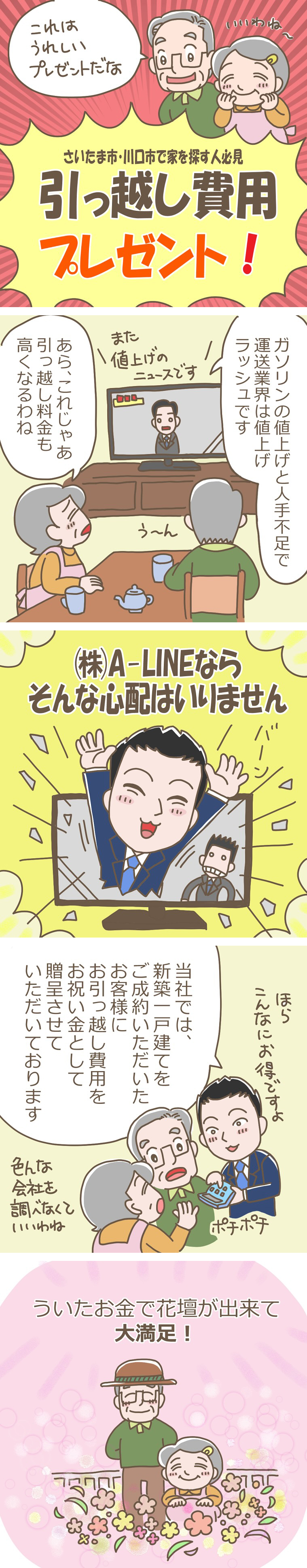 当社で「 新築一戸建て 」をご成約頂いたお客様が新居にお引越しされる際の引越し費用をお祝い金として贈呈いたします。