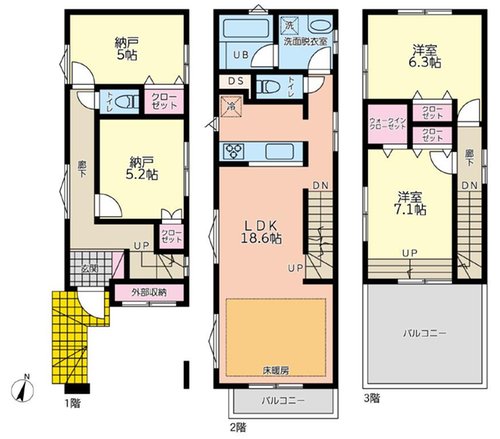 | 築年月 | 2019年12月築 | 間取り | 4LDK (LDK18.6/納戸5.2/洋室7.1/納戸5/洋室6.3) | ||