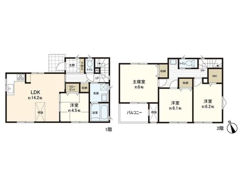 ・2階各洋室6帖以上、主寝室は約8帖にバルコニー付