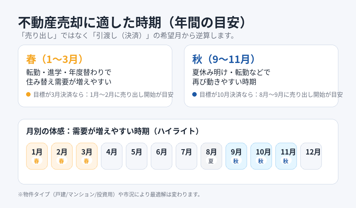 〖図解〗不動産売却に適した時期|「春・秋が有利」は本当?税金の境目まで逆算して後悔しない売り時