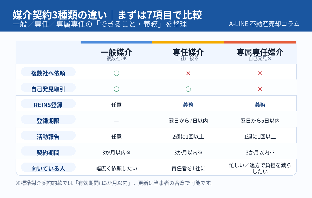 〖図解〗媒介契約3種類の違い|一般・専任・専属専任を「自由度×義務」で整理(不動産売却)