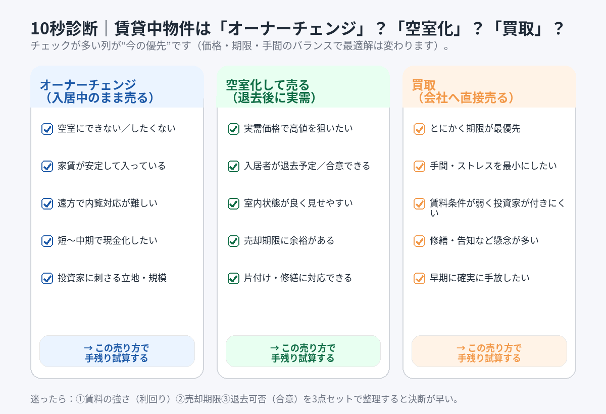 〖図解〗賃貸中の物件を売却する流れと注意点|オーナーチェンジ・空室化・買取の選び方