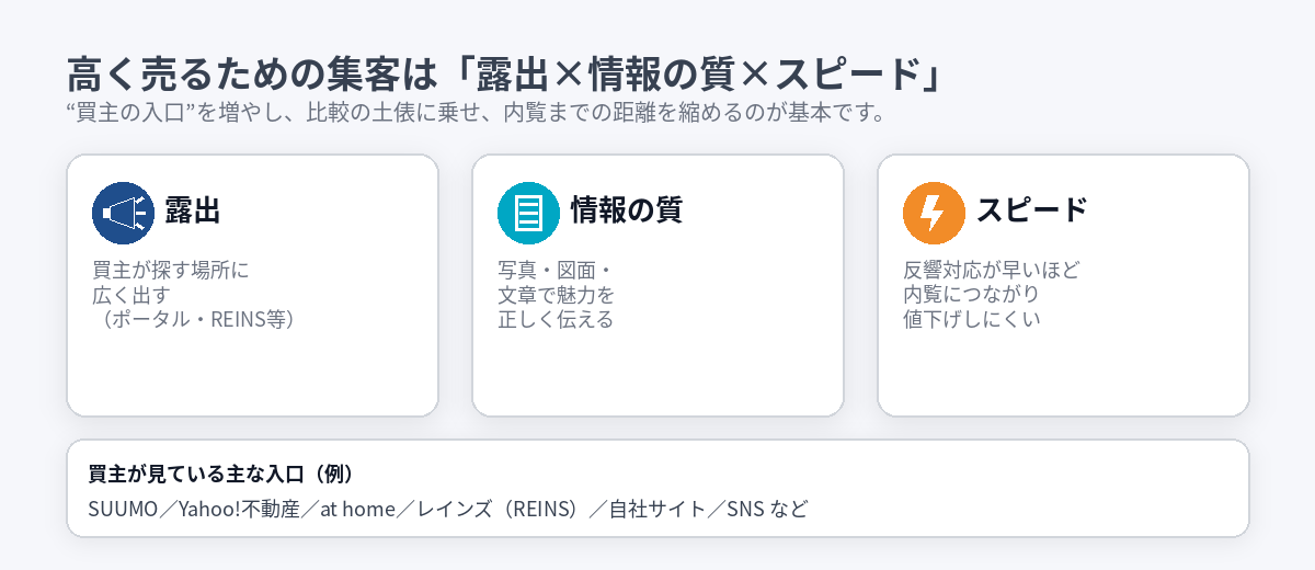 不動産を少しでも高く売るには?相場の掴み方、売出価格と着地価格の決め方、内覧で評価を上げる見せ方、広告・反響対応、値引き交渉の考え方まで図解で整理。高値成約の確率を上げる実践チェック付き。