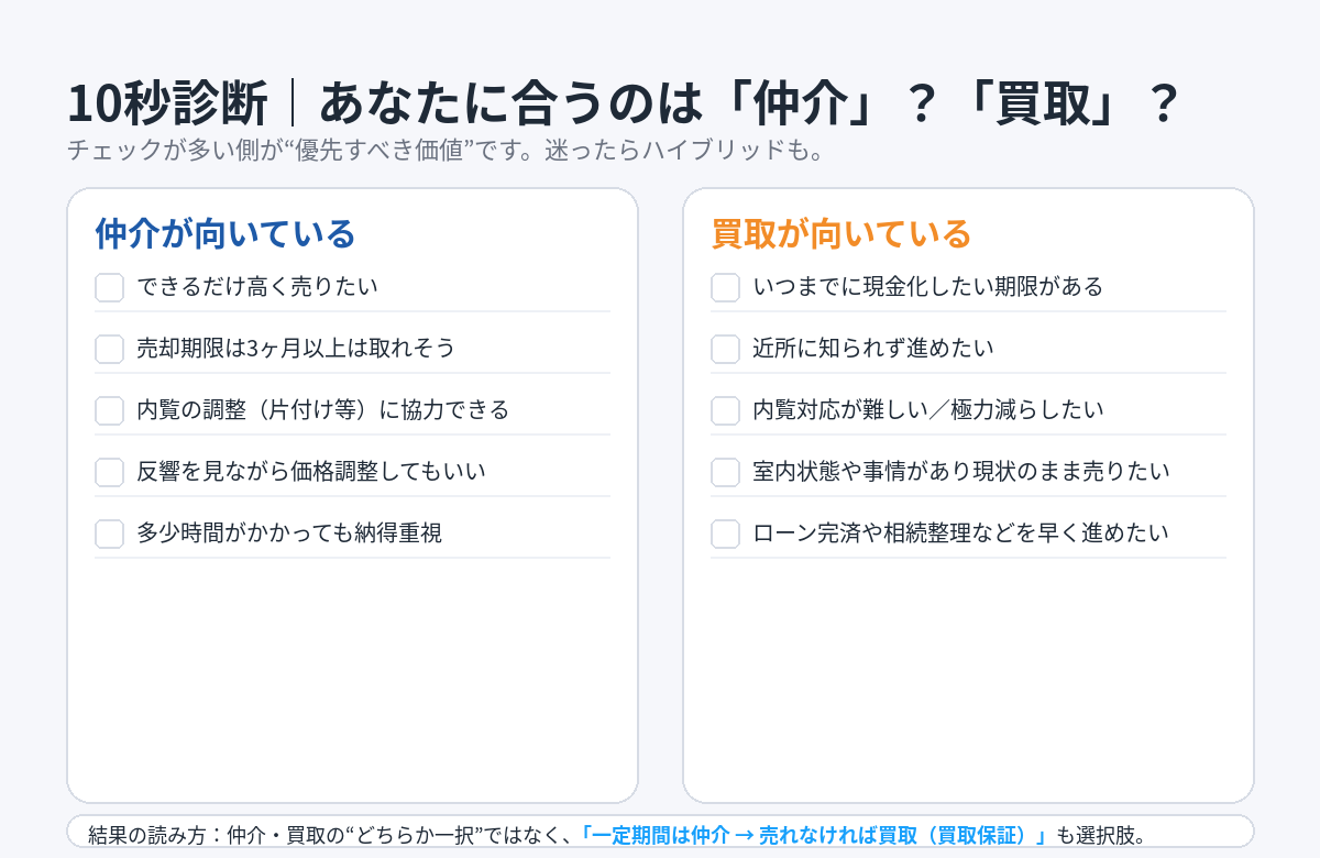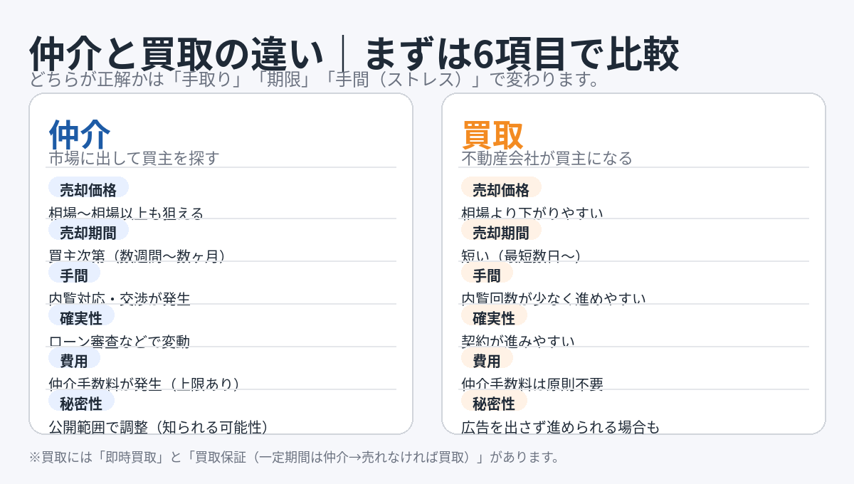 この記事では、仲介と買取の違いを 「6項目比較」+「向いている人」で整理し、迷ったときの結論まで図解します。