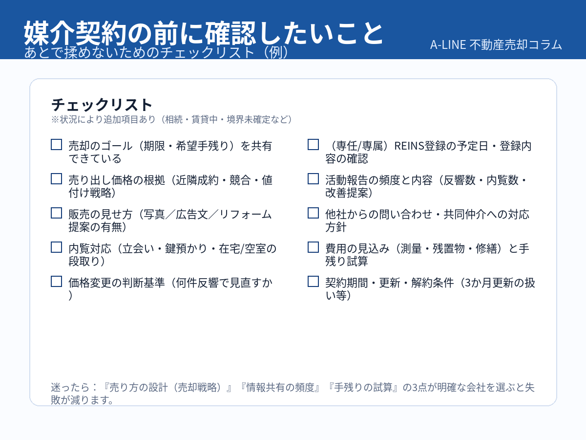 ※本記事は一般情報です。最終的な判断は、実際の媒介契約書・約款の内容確認のうえ、必要に応じて専門家へご相談ください。