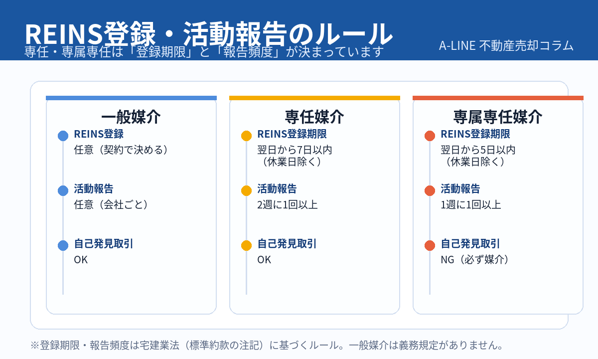 専任媒介:REINS登録期限(7日以内)+活動報告(2週に1回以上)の枠組み