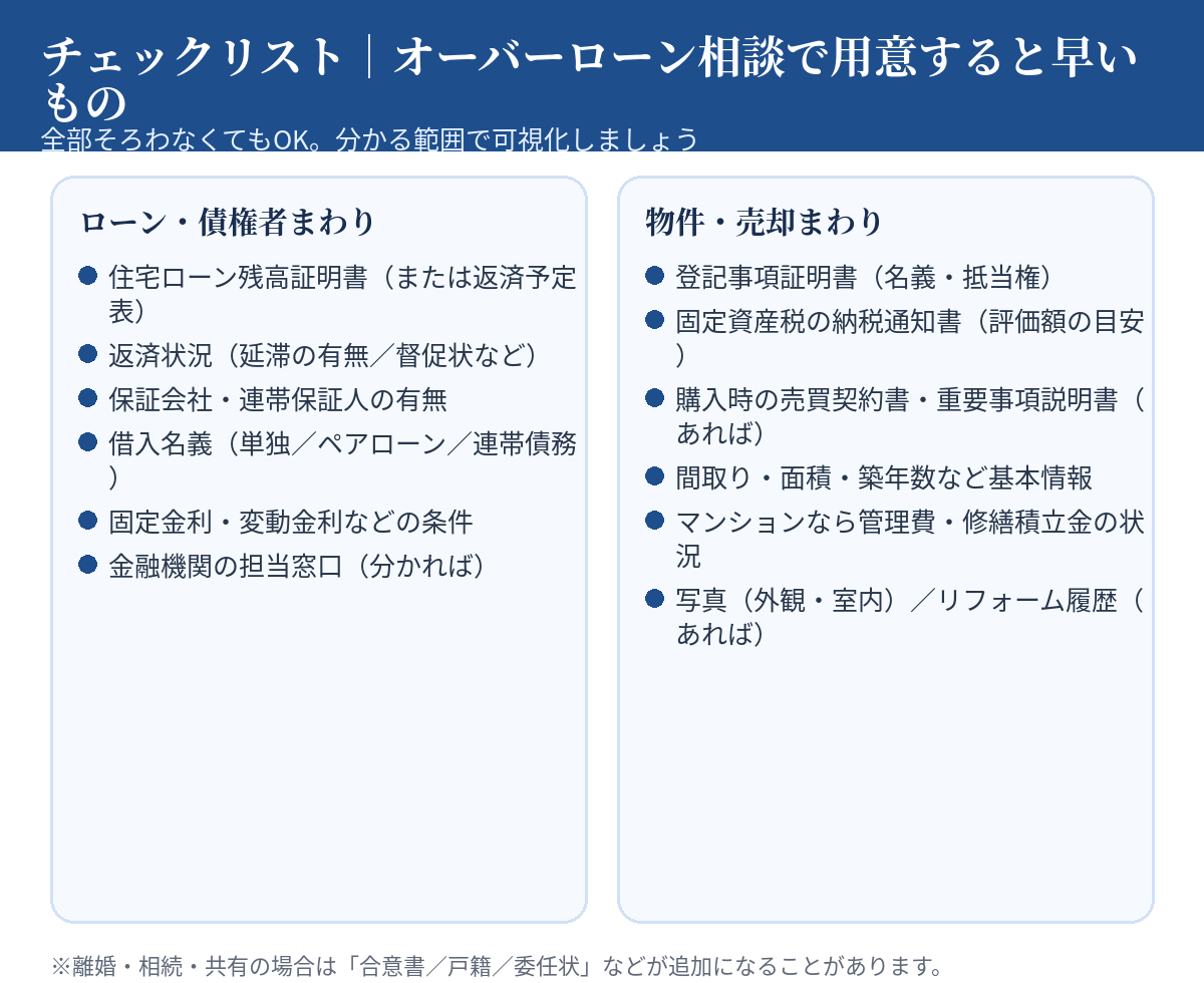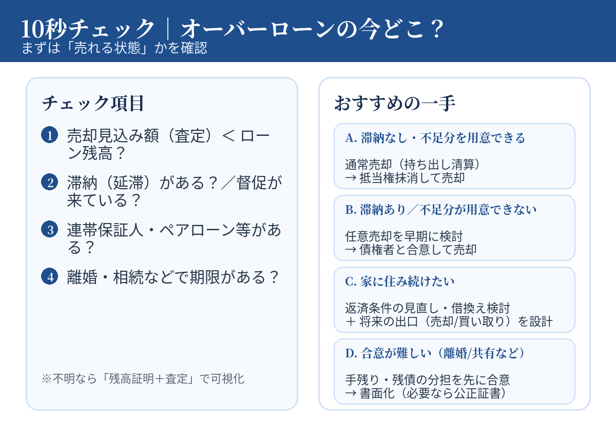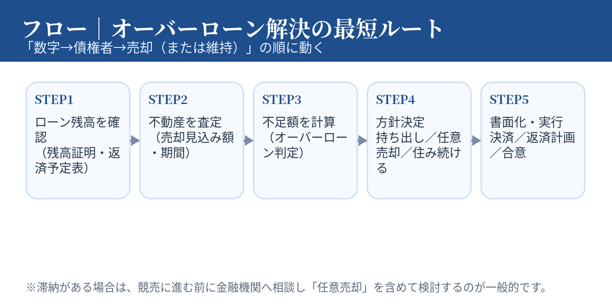 オーバーローンで重要なのは、売却そのものより “残債をどう片付けるか” です。