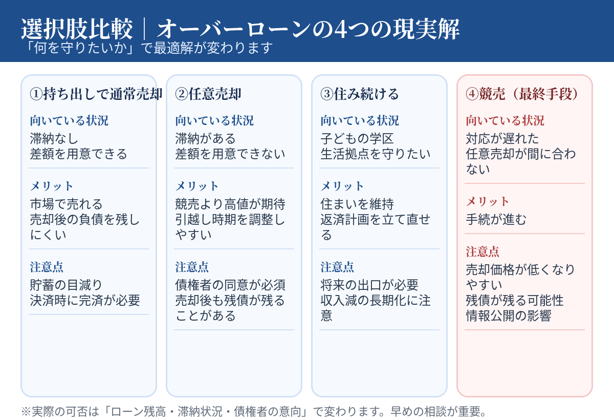 図解:選択肢比較(持ち出し/任意売却/住み続ける/競売)