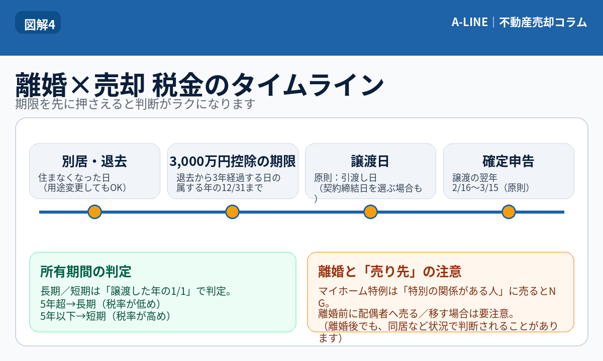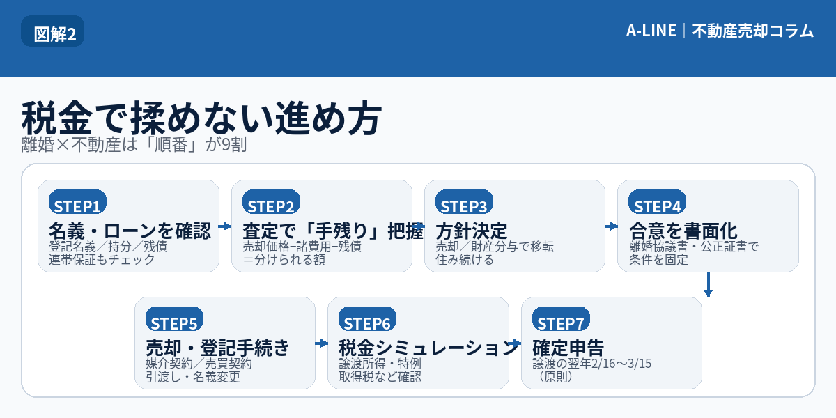 離婚に伴う不動産の売却・名義変更で発生しやすい税金(譲渡所得、財産分与の注意点、確定申告)を図解で解説。損しない進め方と必要書類も整理。