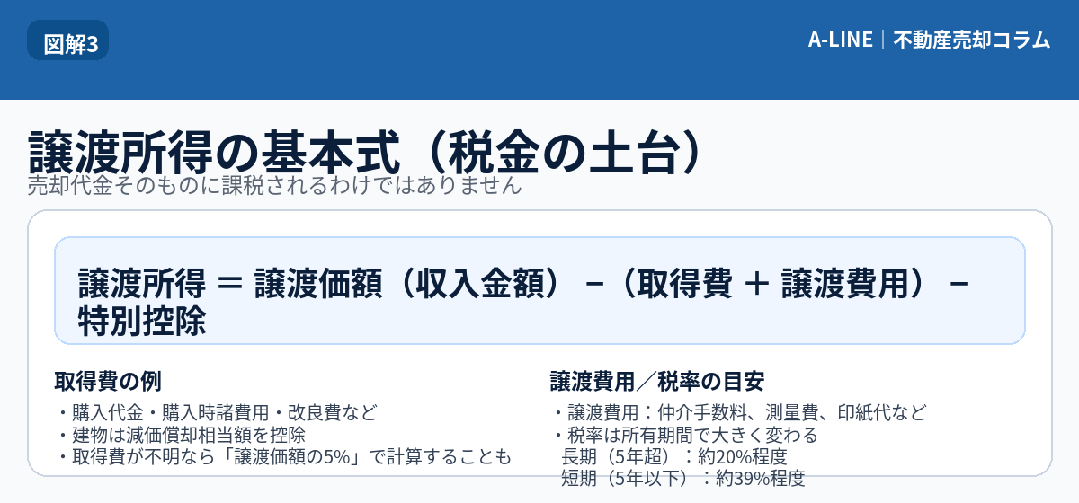 譲渡所得 = 売却代金 −(取得費+譲渡費用)− 特別控除
