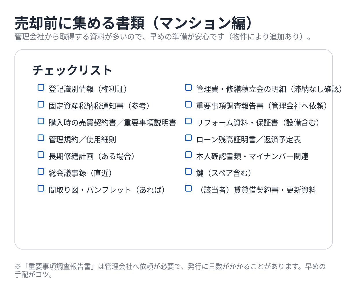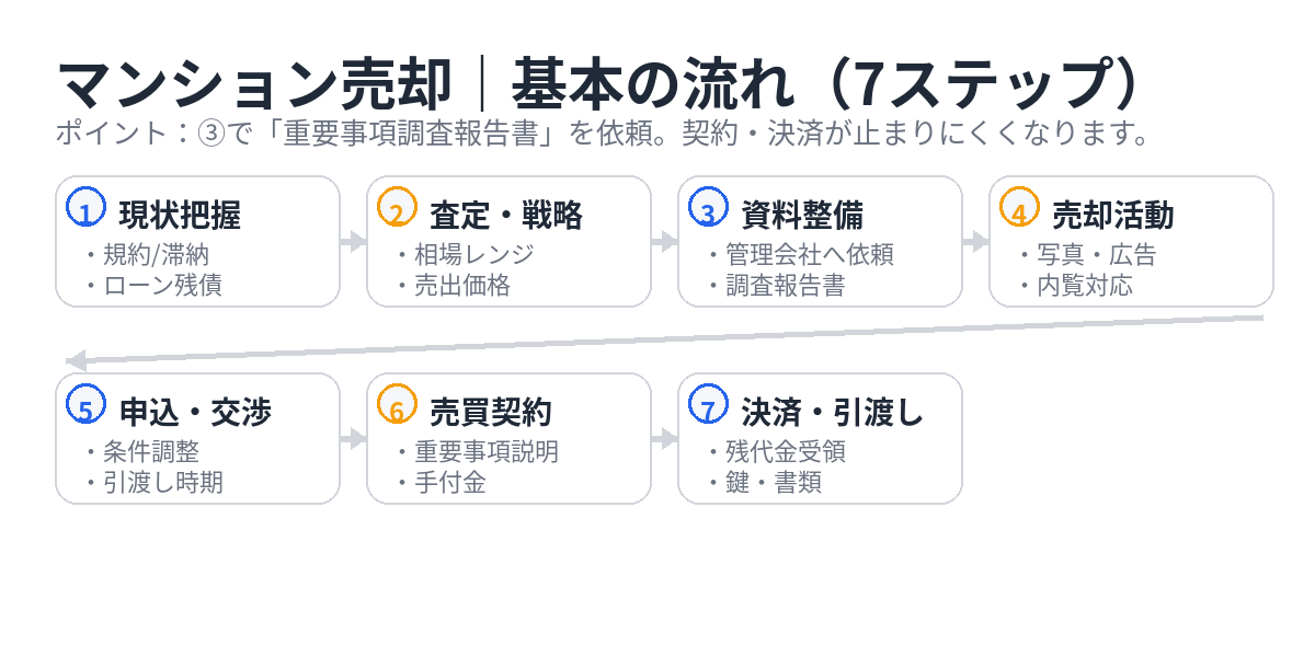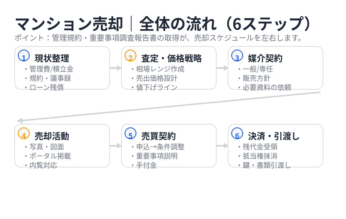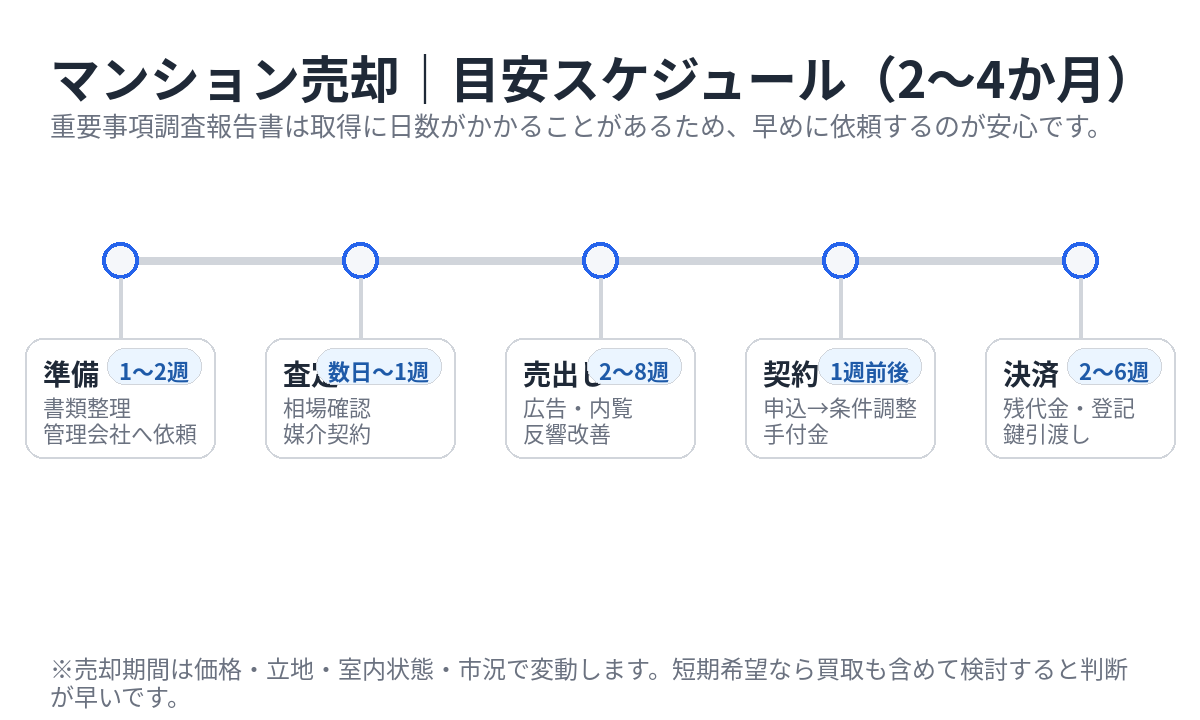 売却は「査定→売り出し」だけで進むように見えますが、マンションでは 管理会社から取り寄せる書類(重要事項調査報告書など) がボトルネックになり、契約・決済がズレることがあります。