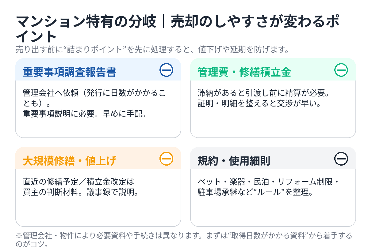 マンションを売却するとき、戸建てと大きく違うのは 「管理(規約・修繕・費用)」の情報量 です。