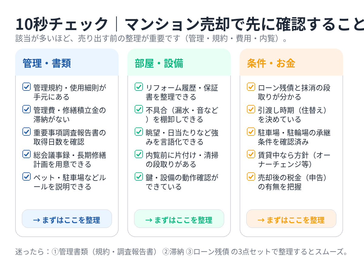 マンション売却で失敗しにくくするコツは、売り出す前に次の3つを整理することです。