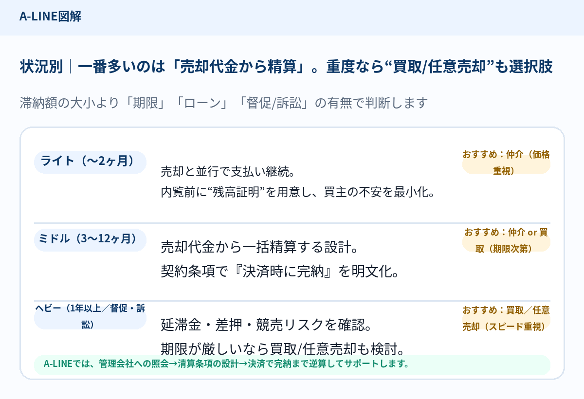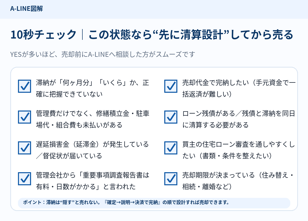滞納がある売却は、感覚で進めると「申込みが入ったのに契約で止まる」「決済当日に不足して引渡し延期」「説明不足でトラブル化」が起きやすい分野です。