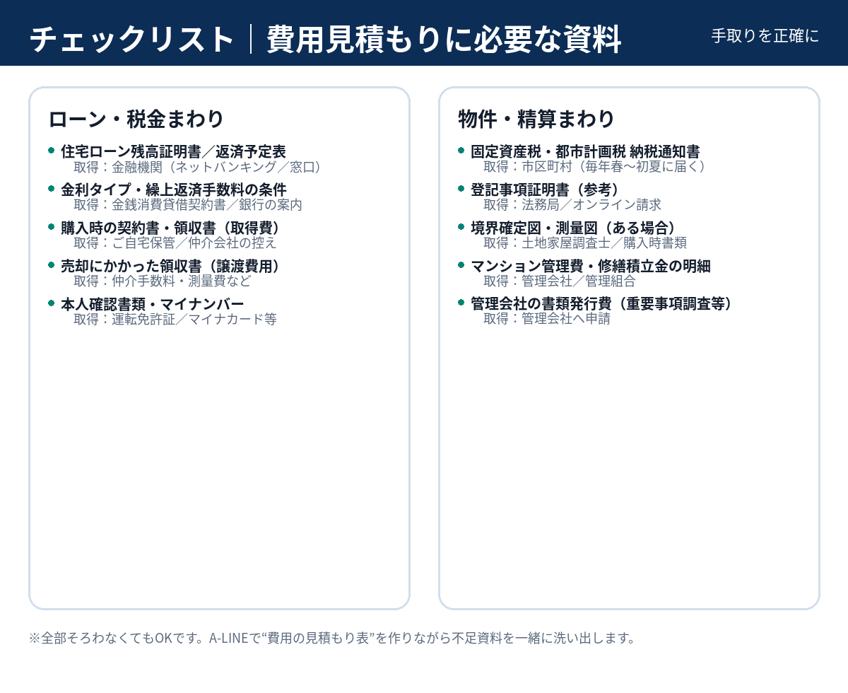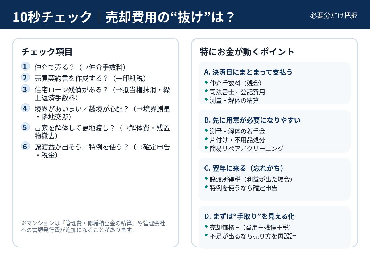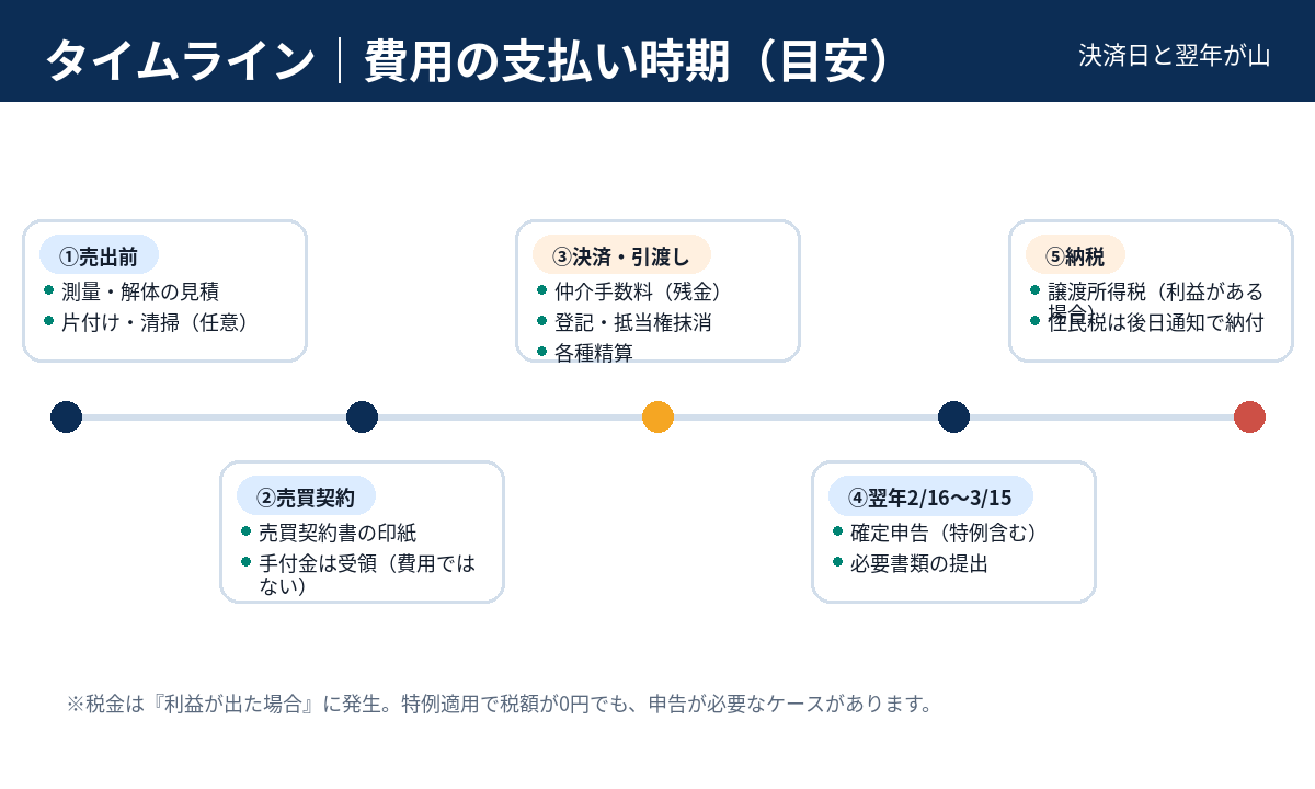登記(抵当権抹消)・印紙税・測量・解体・片付け・税金(翌年)まで含めて、先に見える化しておくと「手取りのズレ」を防げます。