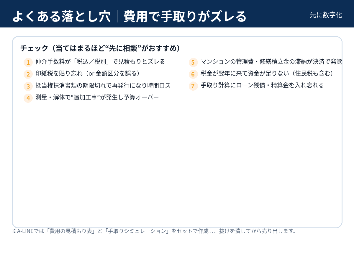 A-LINEでは、売却価格だけでなく 「手取り(残るお金)」を先に見える化 してから売り出します。
