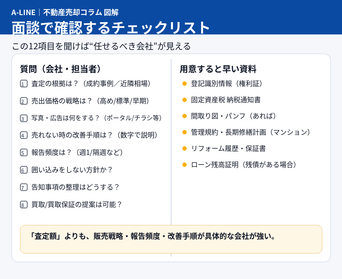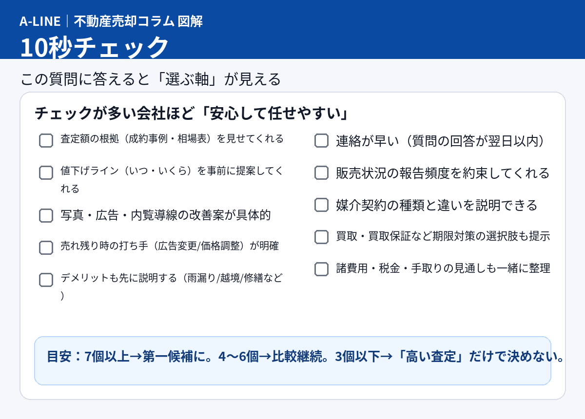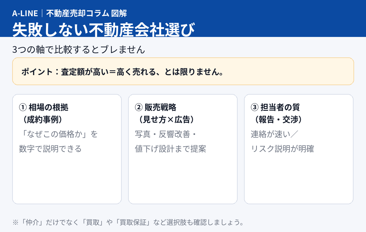【図解】不動産会社の選び方|「高い査定」だけで決めないチェックリスト(仲介・買取も比較)|不動産売却コラム | 【仲介手数料無料】さいたま市緑区・東浦和の不動産情報ならA-LINE(エーライン)
