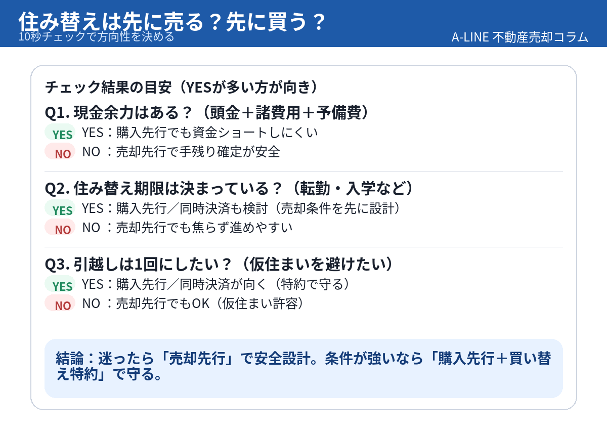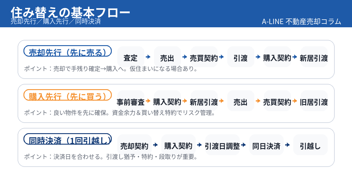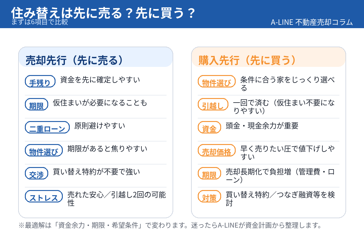 〖図解〗住み替えは先に売る?先に買う?|失敗しない判断基準と段取り(資金・期限・ストレスで判断)|不動産売却コラム | 【仲介手数料無料】さいたま市緑区・東浦和の不動産情報ならA-LINE(エーライン)