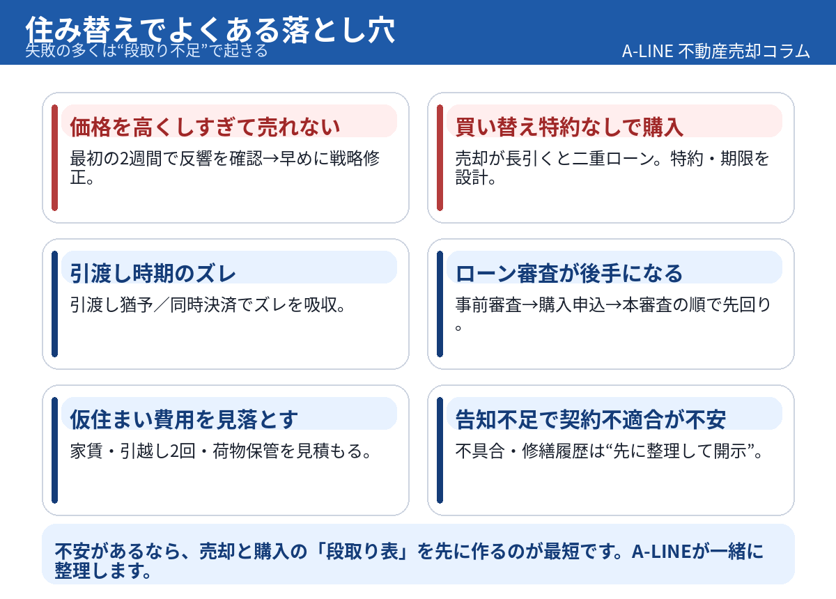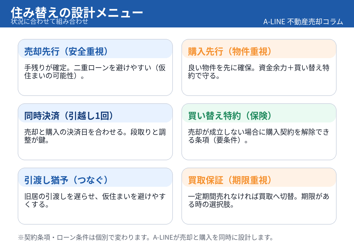 住み替えは「売る/買う」の二択ではなく、特約・日程・資金調整で安全度が変わります。