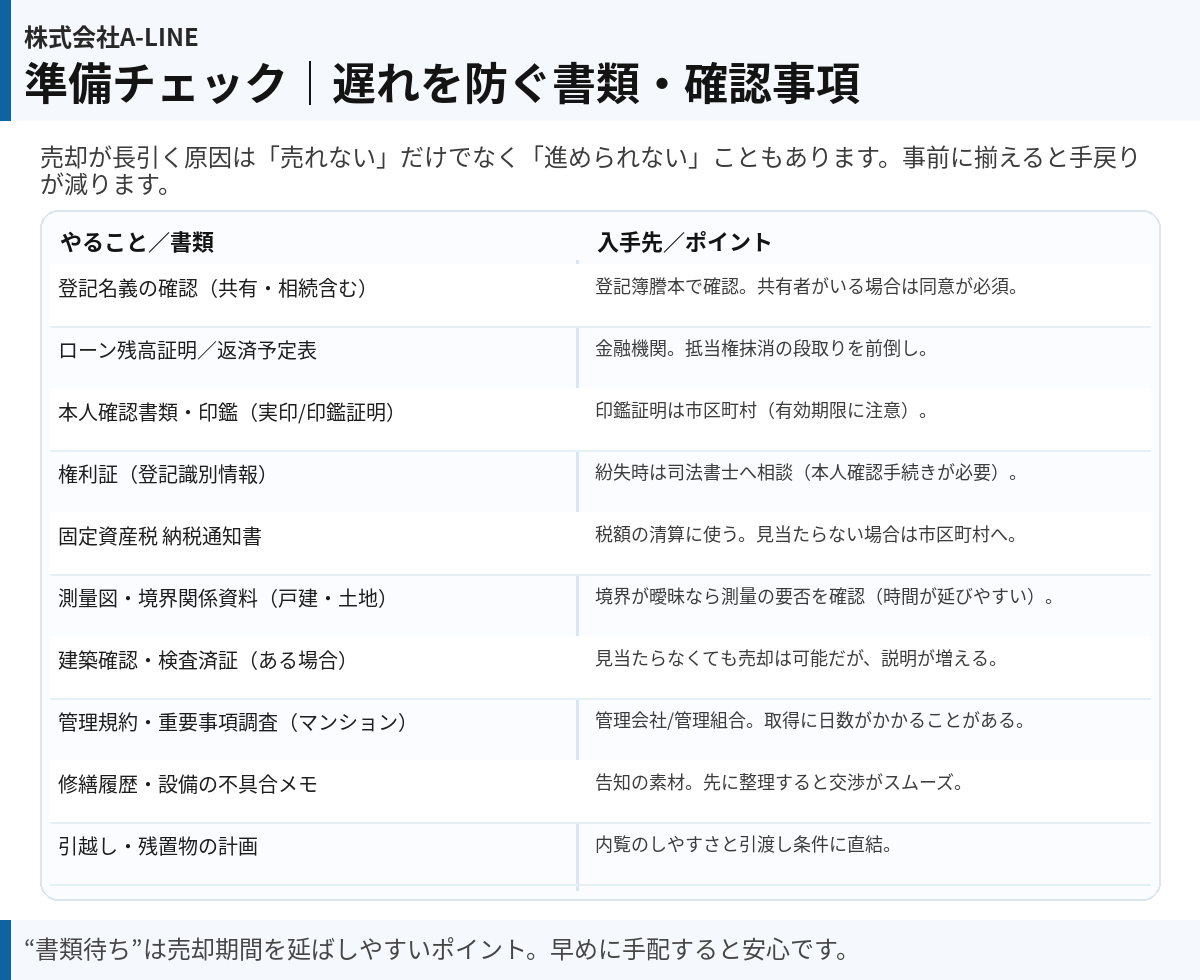 特に、戸建・土地は 境界/測量、相続・共有は 同意/書類 がボトルネックになりがちです。