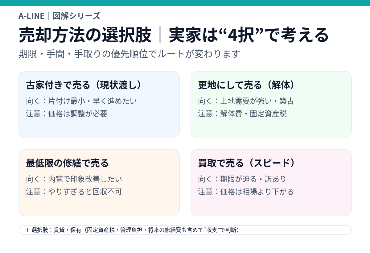 この記事では、相続した実家を売るときの選択肢と進め方を、A-LINEスタッフが図解でわかりやすく整理します。