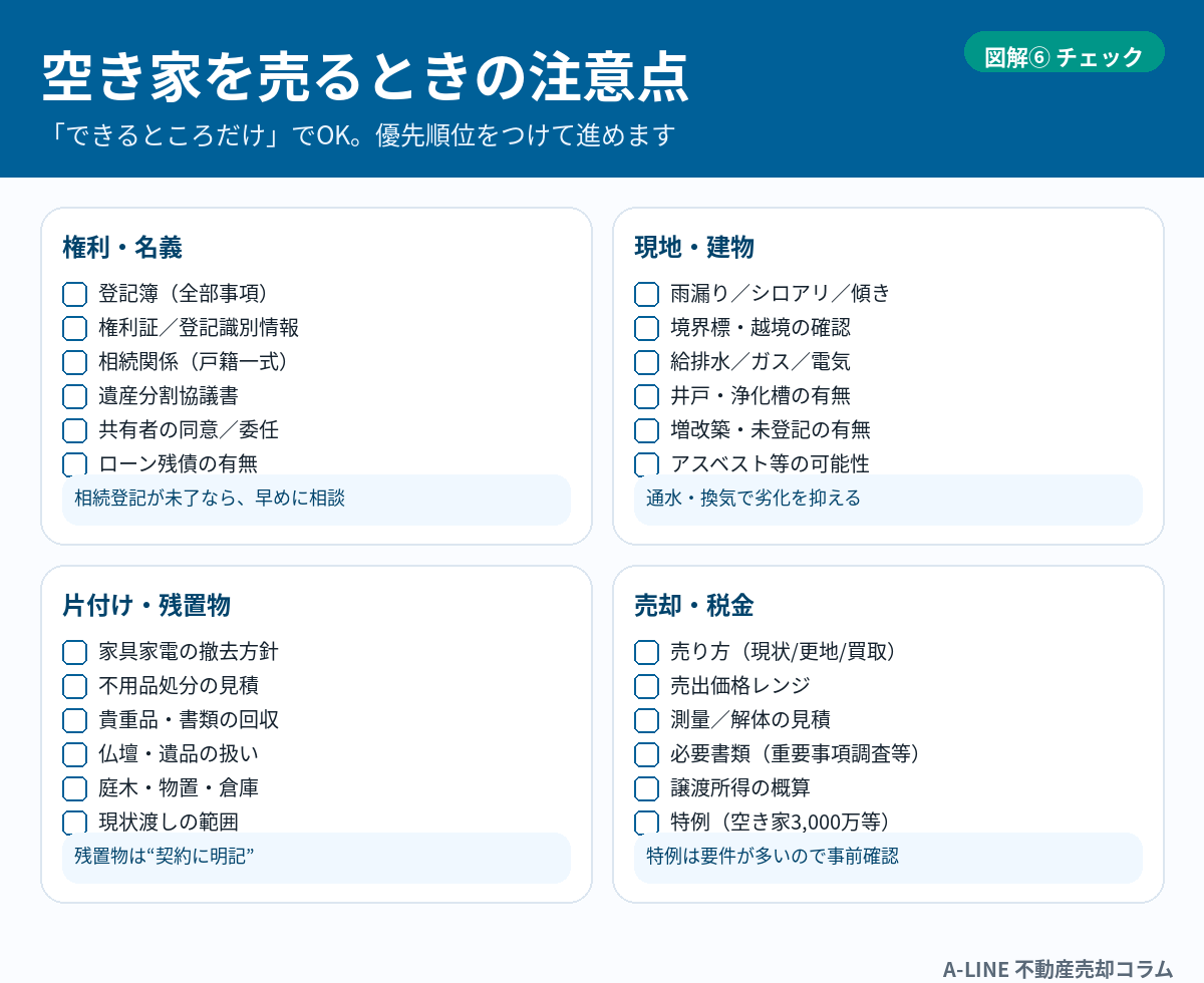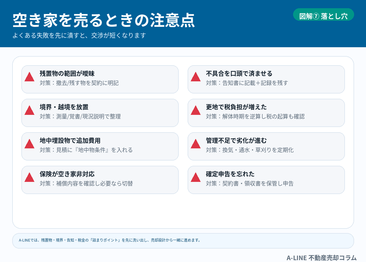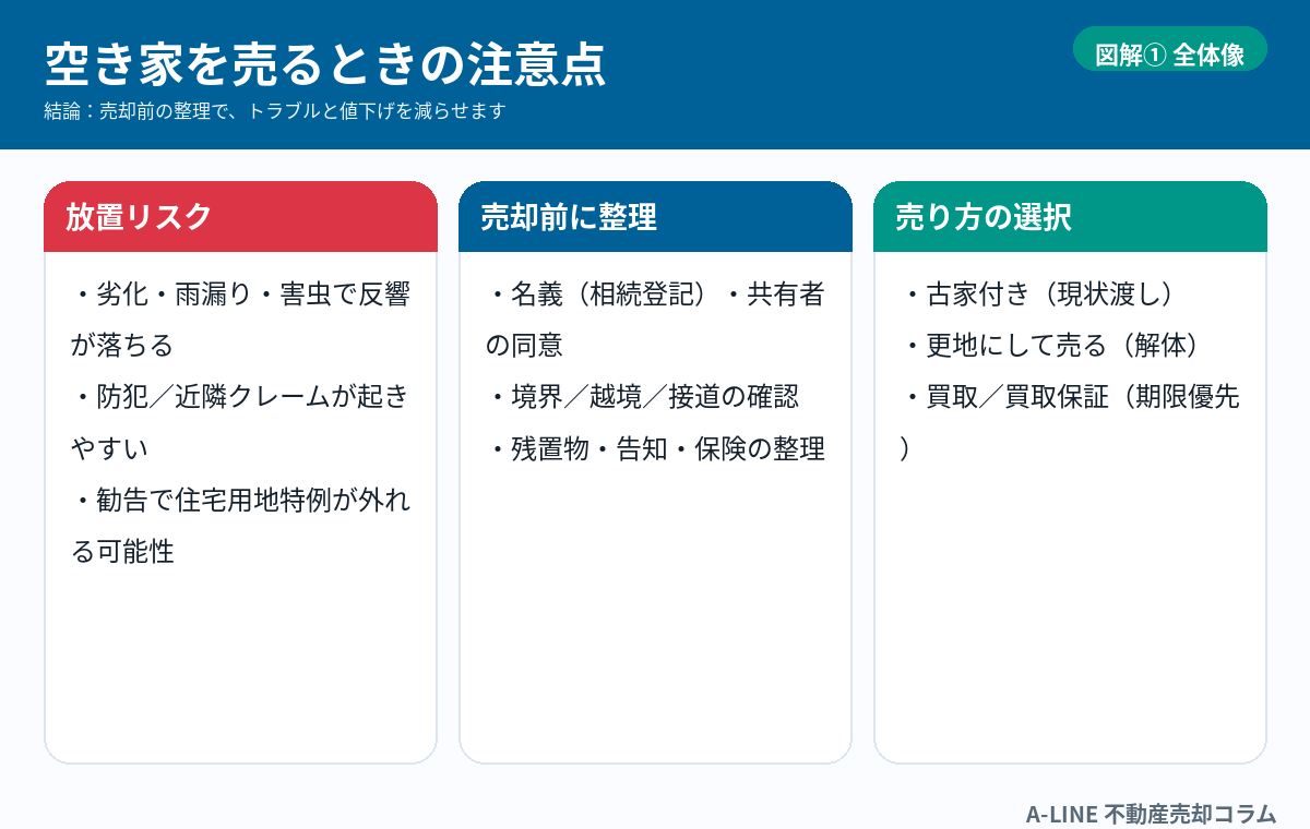 〖図解〗空き家を売るときの注意点|放置リスク・残置物・税金トラブルを先に潰す(A‑LINE)
