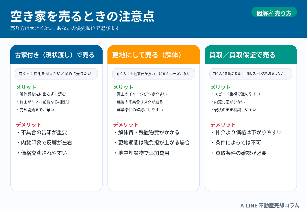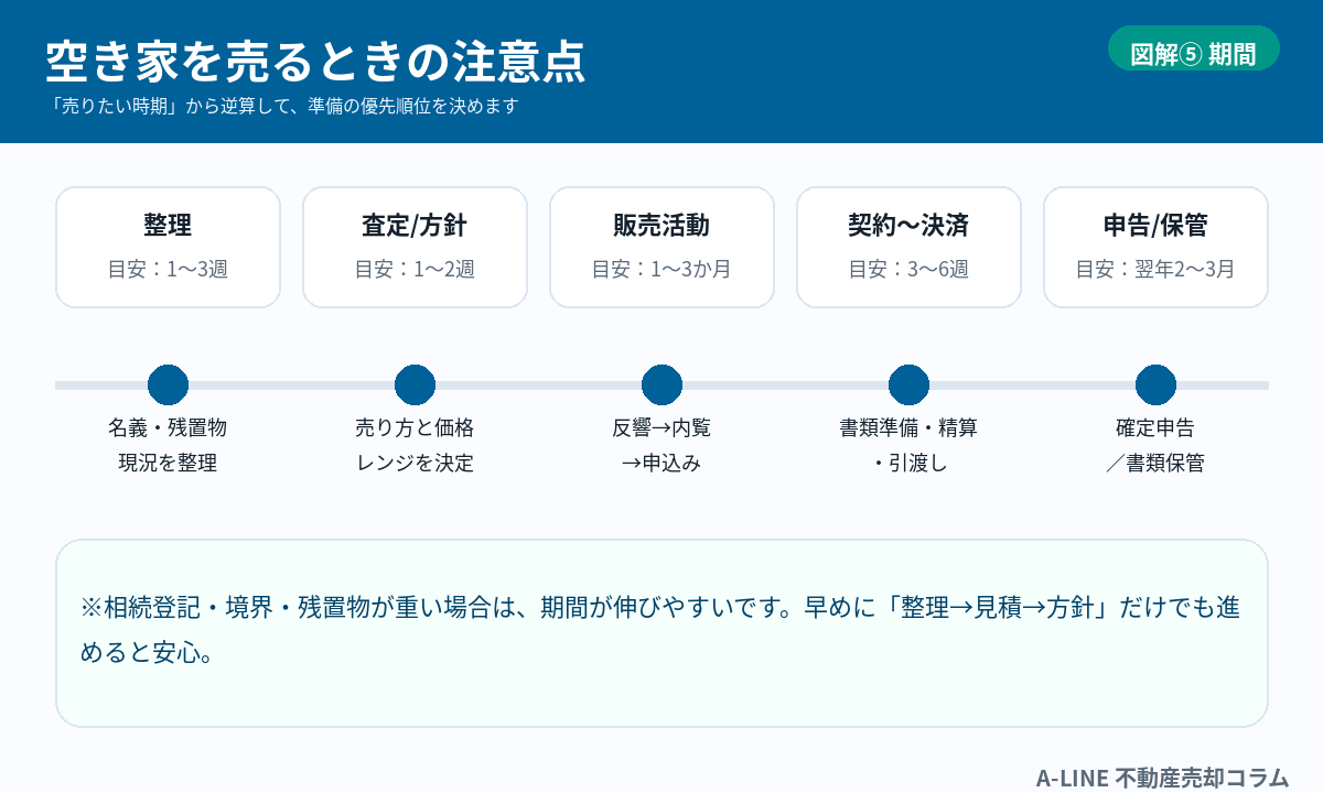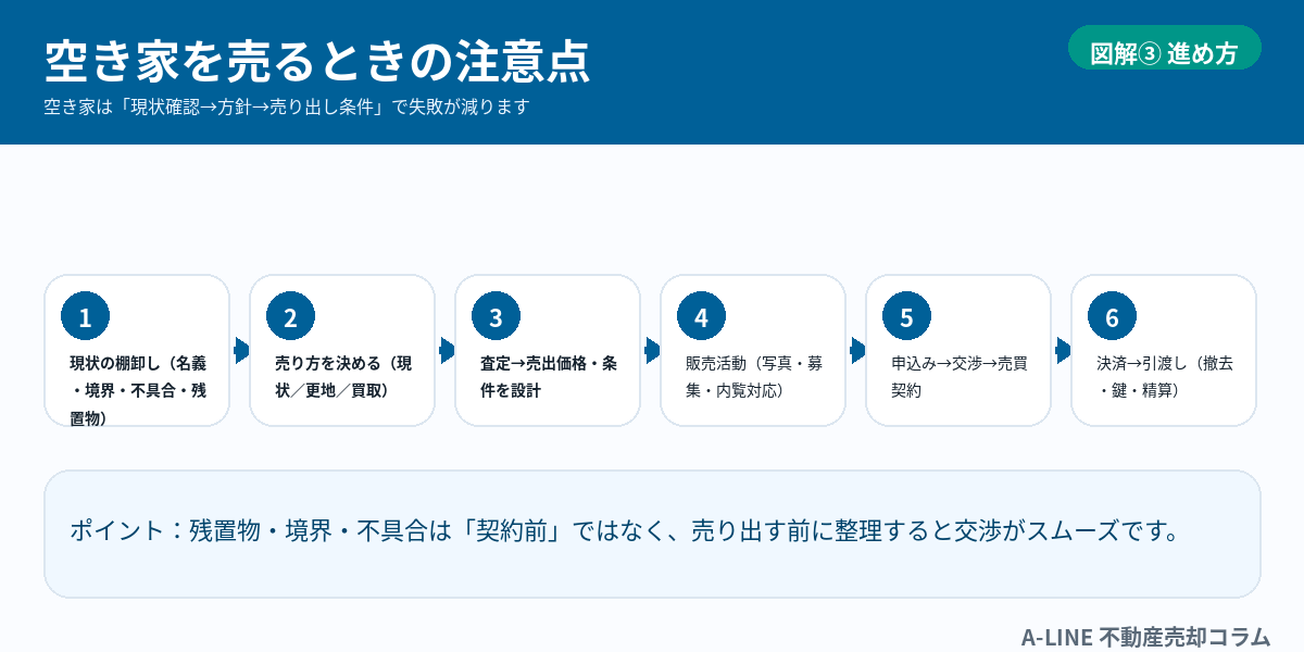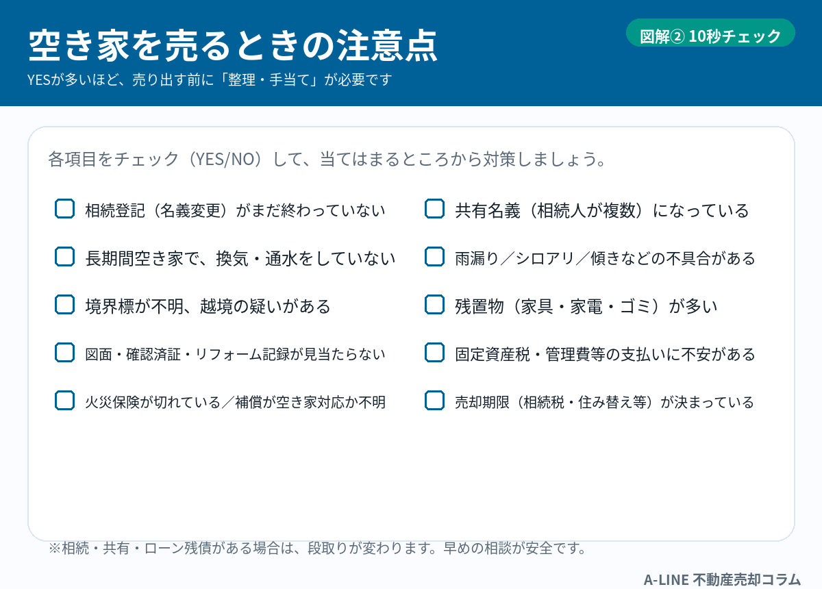 〖図解〗空き家を売るときの注意点|放置リスク・残置物・税金トラブルを先に潰す(A‑LINE)
